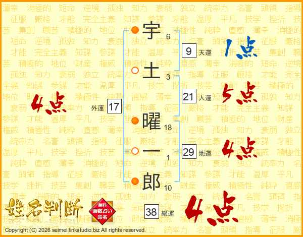 宇土曜一郎さんの総運は38画の4点!