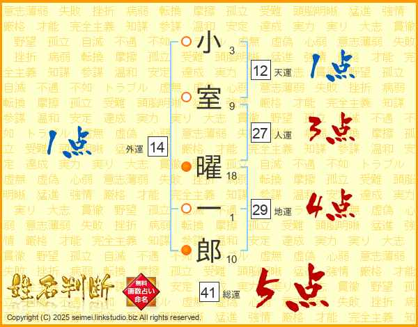小(3画)室(9画) 曜(18画)一(1画)郎(10画)