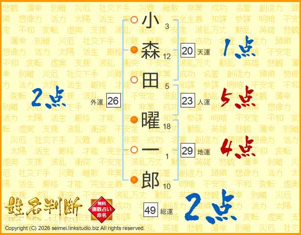小(3画)森(12画)田(5画) 曜(18画)一(1画)郎(10画)
