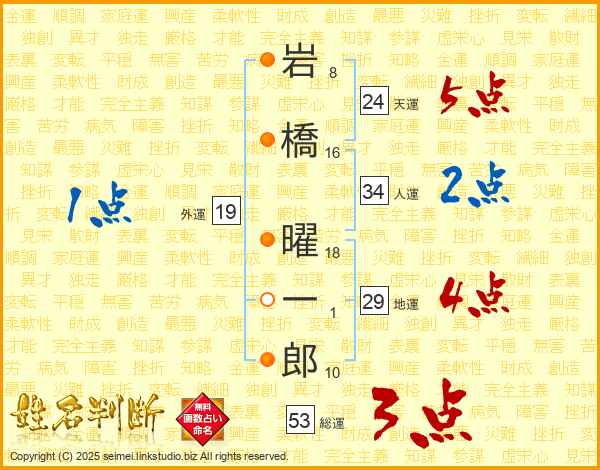岩(8画)橋(16画) 曜(18画)一(1画)郎(10画)
