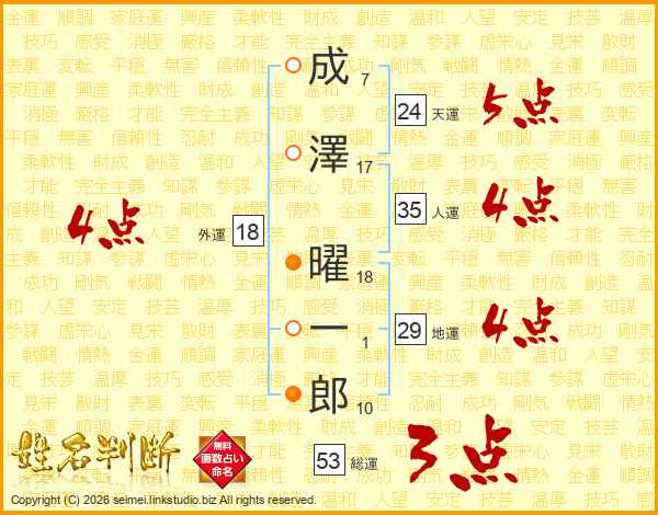 成(7画)澤(17画) 曜(18画)一(1画)郎(10画)