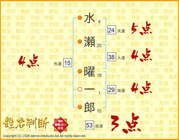水(4画)瀬(20画) 曜(18画)一(1画)郎(10画)