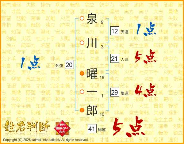泉(9画)川(3画) 曜(18画)一(1画)郎(10画)