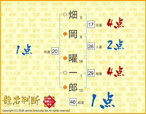 畑(9画)岡(8画) 曜(18画)一(1画)郎(10画)
