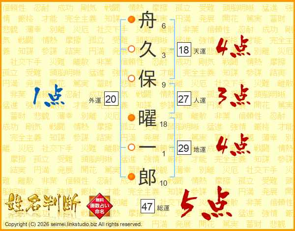 舟(6画)久(3画)保(9画) 曜(18画)一(1画)郎(10画)