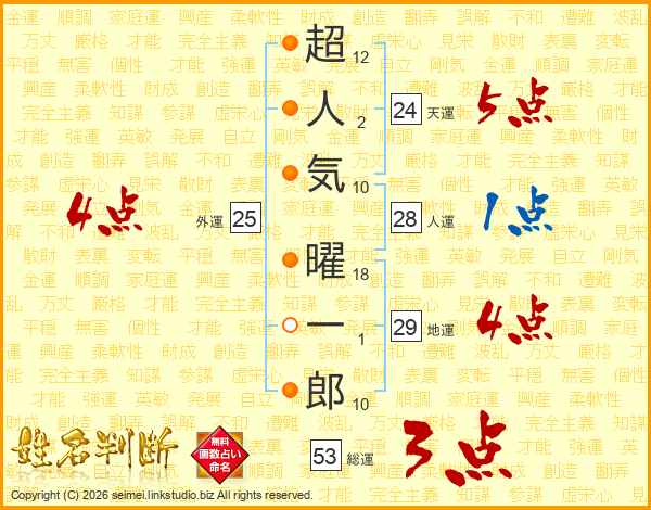 超(12画)人(2画)気(10画) 曜(18画)一(1画)郎(10画)