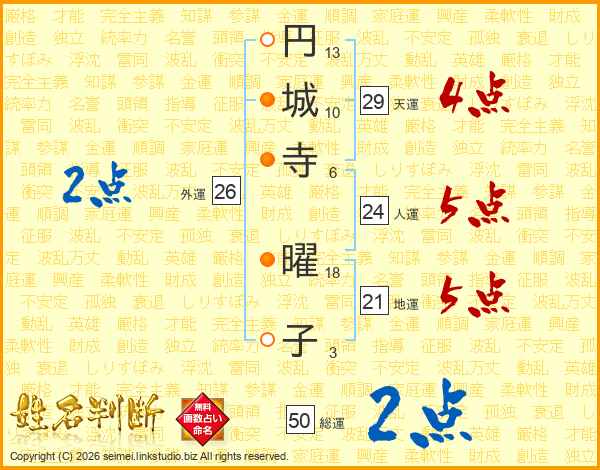 円(13画)城(10画)寺(6画) 曜(18画)子(3画)