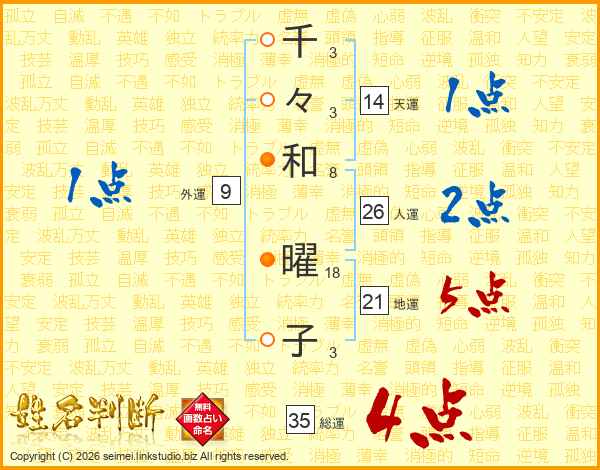 千(3画)々(3画)和(8画) 曜(18画)子(3画)