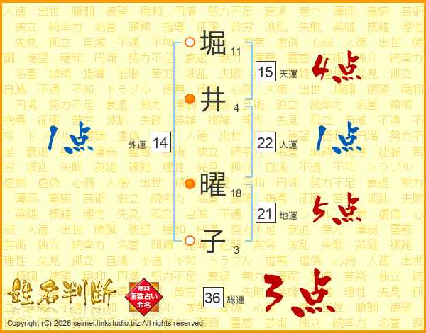 生活面を象徴する運勢です。外部から受ける影響力を表し、結婚運、家庭運や職場、環境への順応性を表します。総運から人運を引いた画数。姓や名が1文字の場合を除く。
