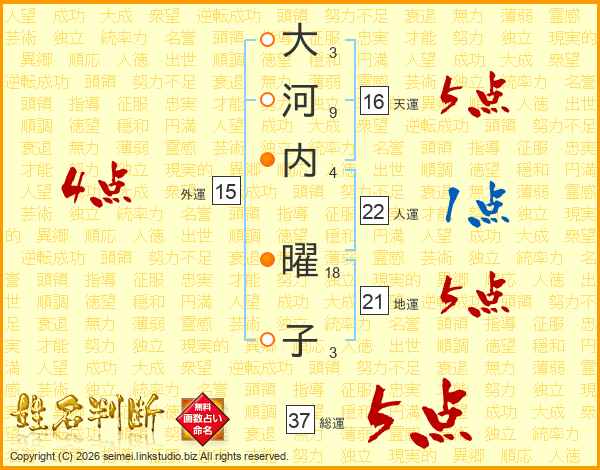 大(3画)河(9画)内(4画) 曜(18画)子(3画)