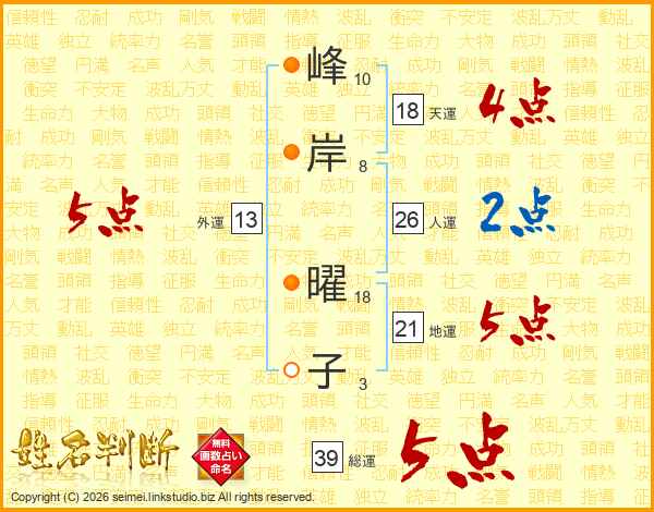 峰(10画)岸(8画) 曜(18画)子(3画)