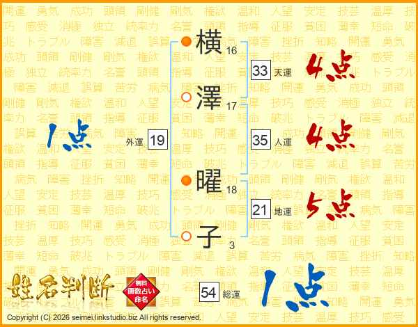 生活面を象徴する運勢です。外部から受ける影響力を表し、結婚運、家庭運や職場、環境への順応性を表します。総運から人運を引いた画数。姓や名が1文字の場合を除く。