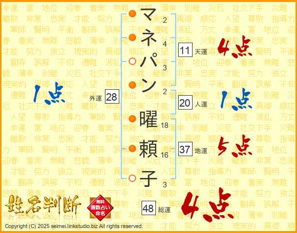 マ(2画)ネ(4画)パ(3画)ン(2画) 曜(18画)頼(16画)子(3画)