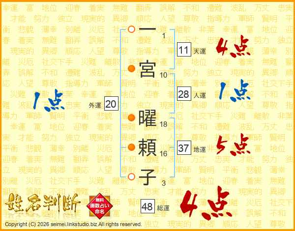 一(1画)宮(10画) 曜(18画)頼(16画)子(3画)