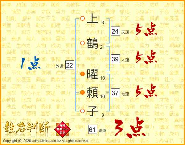 上(3画)鶴(21画) 曜(18画)頼(16画)子(3画)