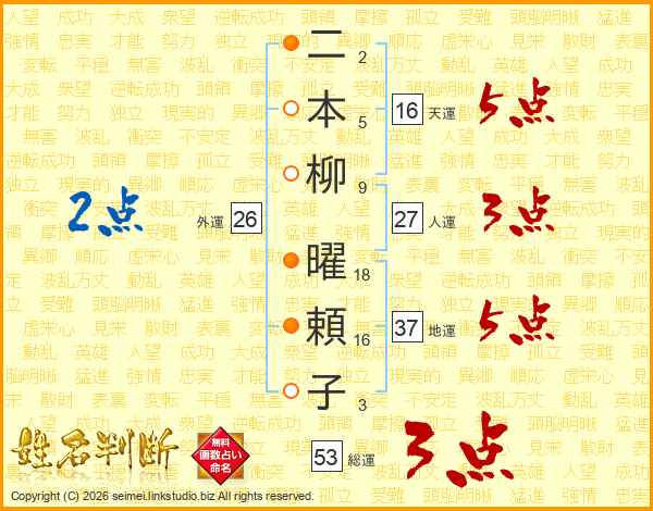 二(2画)本(5画)柳(9画) 曜(18画)頼(16画)子(3画)