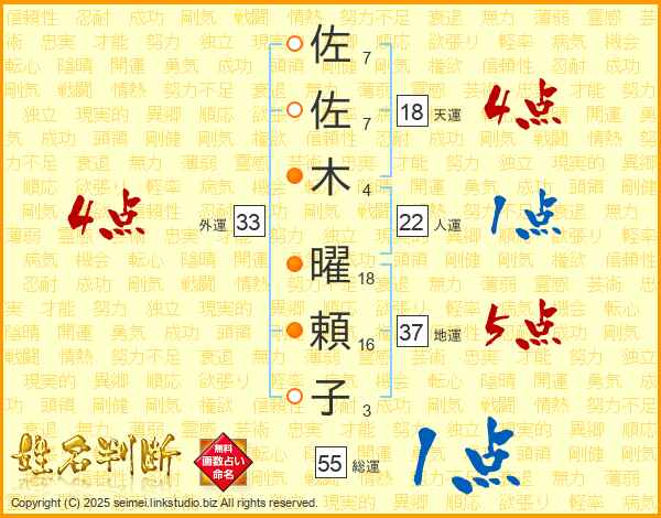 佐(7画)佐(7画)木(4画) 曜(18画)頼(16画)子(3画)