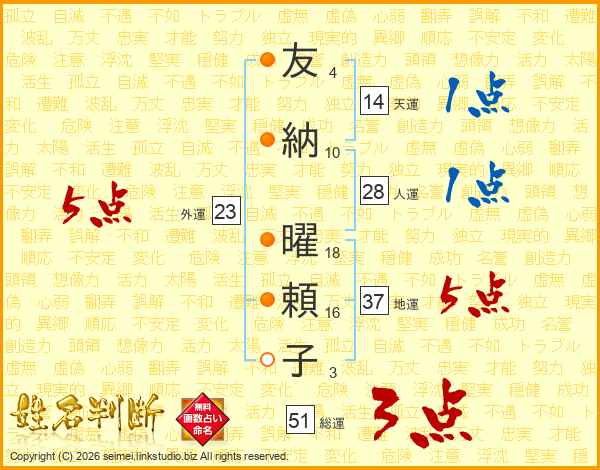 友(4画)納(10画) 曜(18画)頼(16画)子(3画)