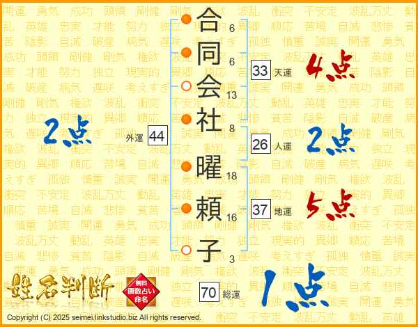 合(6画)同(6画)会(13画)社(8画) 曜(18画)頼(16画)子(3画)