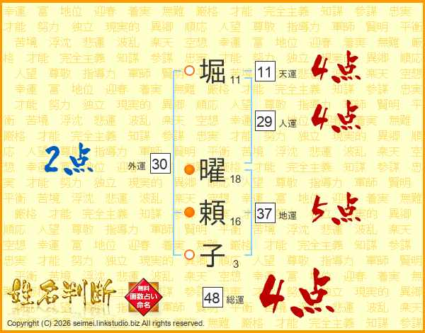 堀(11画) 曜(18画)頼(16画)子(3画)