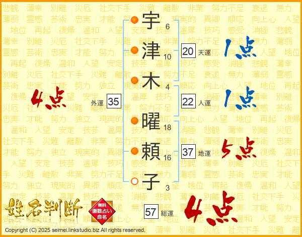宇(6画)津(10画)木(4画) 曜(18画)頼(16画)子(3画)