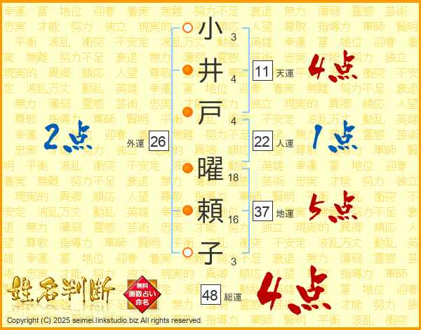 生活面を象徴する運勢です。外部から受ける影響力を表し、結婚運、家庭運や職場、環境への順応性を表します。総運から人運を引いた画数。姓や名が1文字の場合を除く。