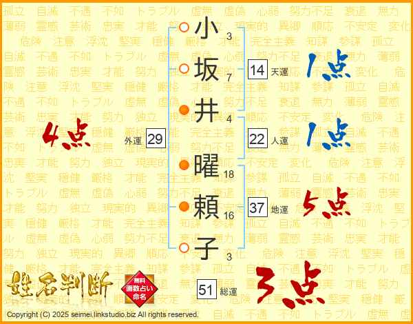 小(3画)坂(7画)井(4画) 曜(18画)頼(16画)子(3画)