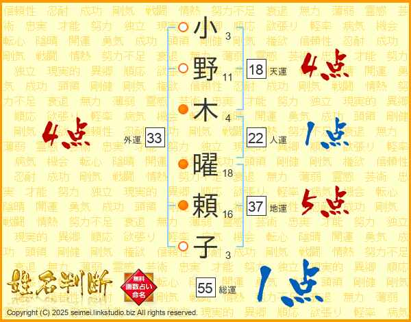 小(3画)野(11画)木(4画) 曜(18画)頼(16画)子(3画)