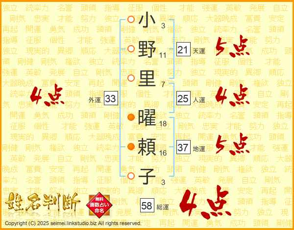 小野里曜頼子さんの人運は25画の4点!