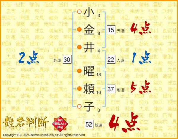 小(3画)金(8画)井(4画) 曜(18画)頼(16画)子(3画)