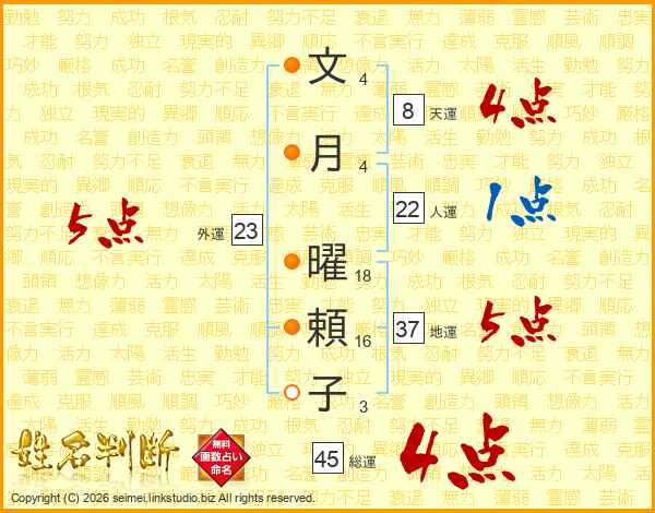 文(4画)月(4画) 曜(18画)頼(16画)子(3画)