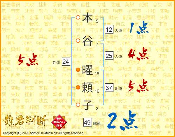本(5画)谷(7画) 曜(18画)頼(16画)子(3画)