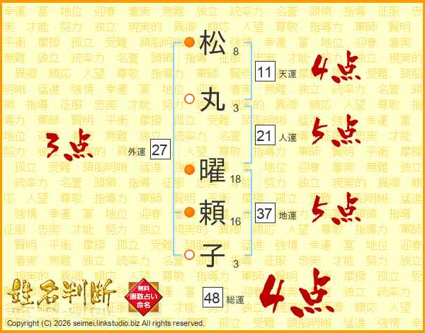 松(8画)丸(3画) 曜(18画)頼(16画)子(3画)