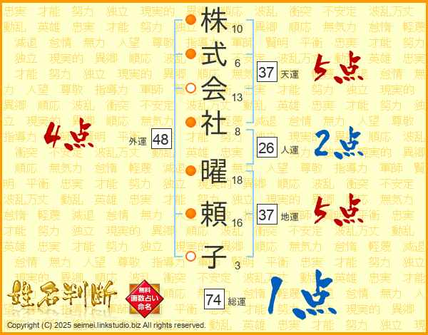 株(10画)式(6画)会(13画)社(8画) 曜(18画)頼(16画)子(3画)