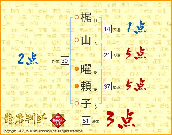 梶(11画)山(3画) 曜(18画)頼(16画)子(3画)