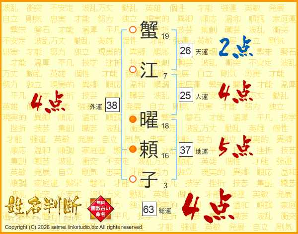 蟹(19画)江(7画) 曜(18画)頼(16画)子(3画)