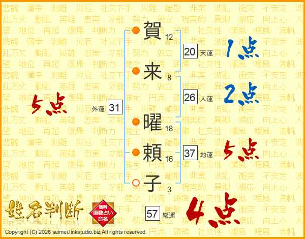 賀(12画)来(8画) 曜(18画)頼(16画)子(3画)