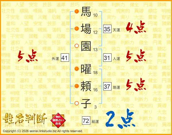 馬(10画)場(12画)園(13画) 曜(18画)頼(16画)子(3画)