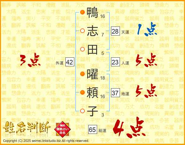 鴨(16画)志(7画)田(5画) 曜(18画)頼(16画)子(3画)