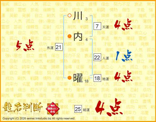 生活面を象徴する運勢です。外部から受ける影響力を表し、結婚運、家庭運や職場、環境への順応性を表します。総運から人運を引いた画数。姓や名が1文字の場合を除く。