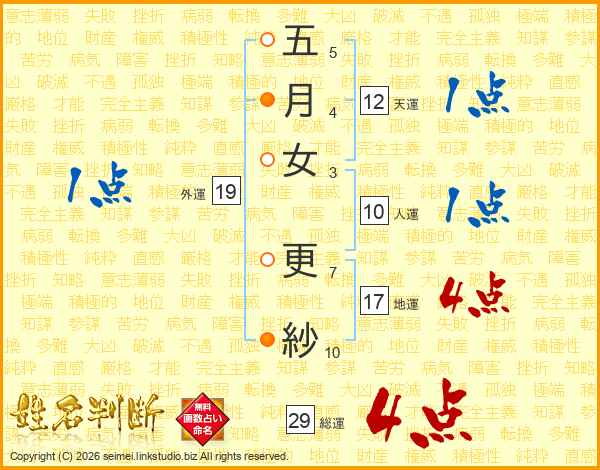 五(5画)月(4画)女(3画) 更(7画)紗(10画)