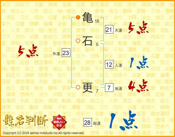 生活面を象徴する運勢です。外部から受ける影響力を表し、結婚運、家庭運や職場、環境への順応性を表します。総運から人運を引いた画数。姓や名が1文字の場合を除く。