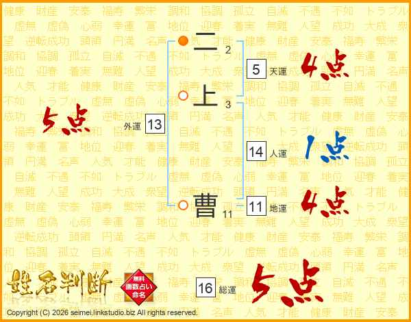 生活面を象徴する運勢です。外部から受ける影響力を表し、結婚運、家庭運や職場、環境への順応性を表します。総運から人運を引いた画数。姓や名が1文字の場合を除く。