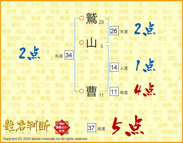 生活面を象徴する運勢です。外部から受ける影響力を表し、結婚運、家庭運や職場、環境への順応性を表します。総運から人運を引いた画数。姓や名が1文字の場合を除く。