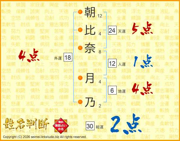 朝(12画)比(4画)奈(8画) 月(4画)乃(2画)
