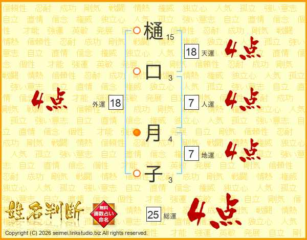 生活面を象徴する運勢です。外部から受ける影響力を表し、結婚運、家庭運や職場、環境への順応性を表します。総運から人運を引いた画数。姓や名が1文字の場合を除く。