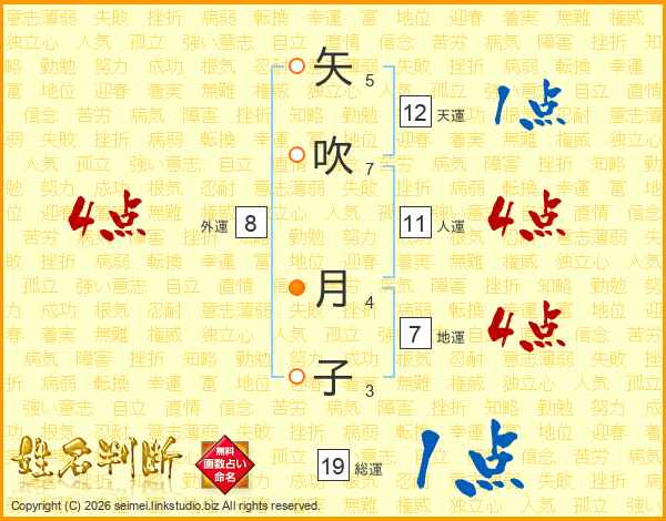 生活面を象徴する運勢です。外部から受ける影響力を表し、結婚運、家庭運や職場、環境への順応性を表します。総運から人運を引いた画数。姓や名が1文字の場合を除く。