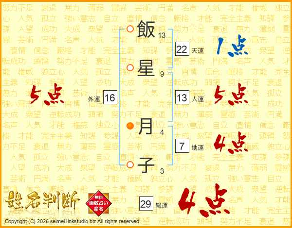 生活面を象徴する運勢です。外部から受ける影響力を表し、結婚運、家庭運や職場、環境への順応性を表します。総運から人運を引いた画数。姓や名が1文字の場合を除く。