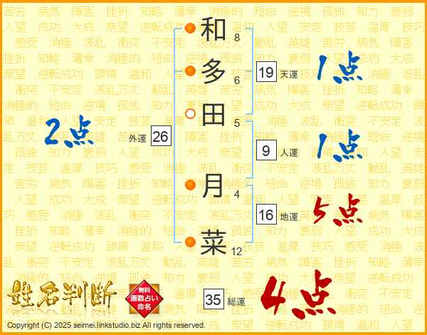和(8画)多(6画)田(5画) 月(4画)菜(12画)