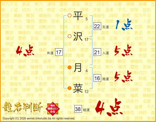 平(5画)沢(17画) 月(4画)菜(12画)